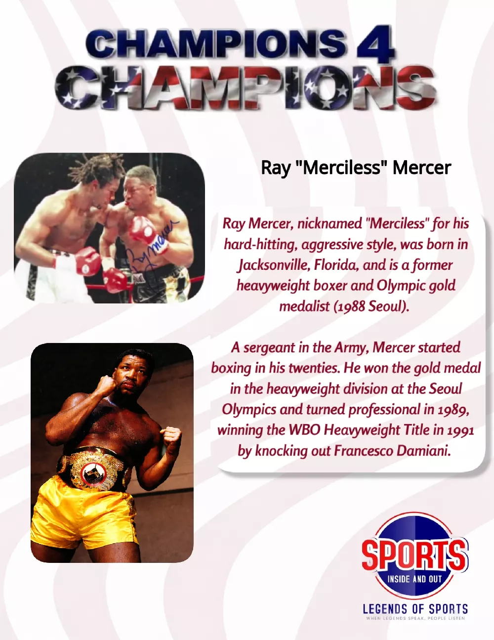 Ray Mercer, nicknamed "Merciless" for his hard-hitting, aggressive style, was born in Jacksonville, Florida, and is a former heavyweight boxer and Olympic gold medalist (1988 Seoul). A sergeant in the Army, Mercer started boxing in his twenties. He won the gold medal in the heavyweight division at the Seoul Olympics and turned professional in 1989, winning the WBO Heavyweight Title in 1991 by knocking out Francesco Damiani.