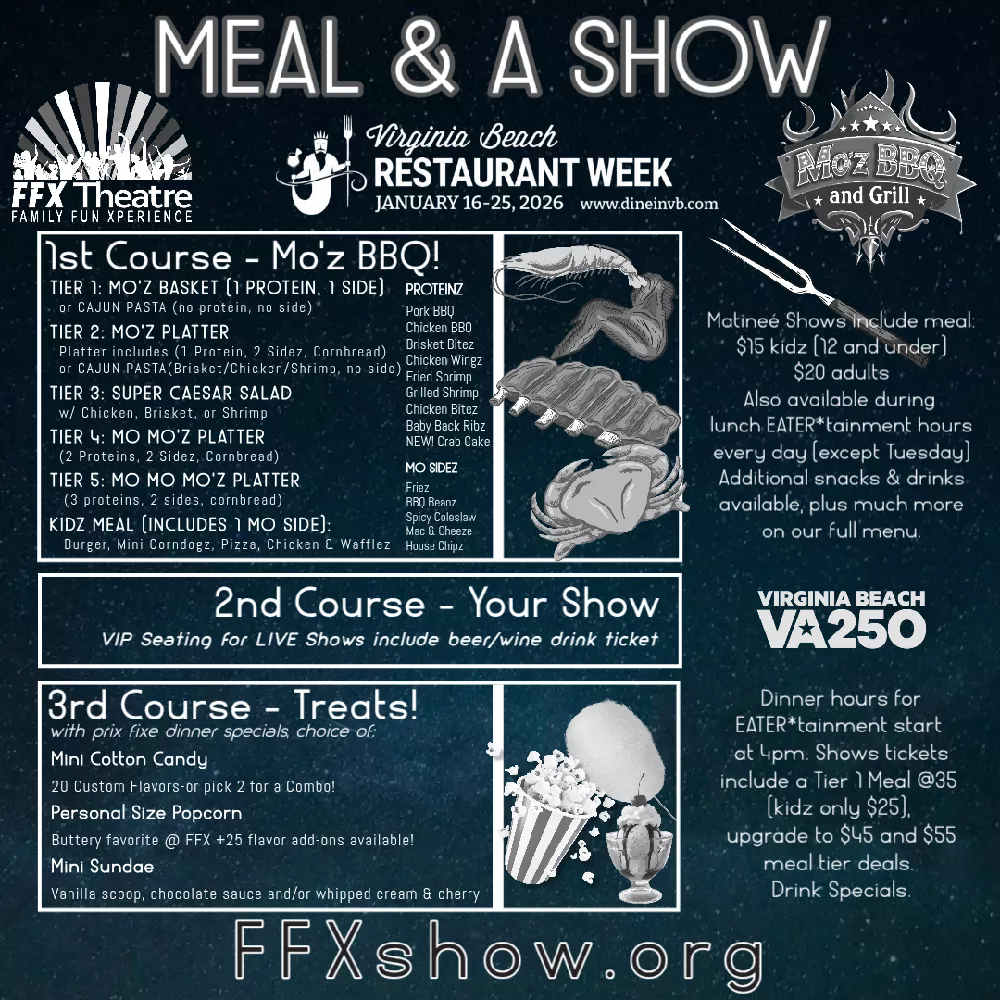 For VB Restaurant Week - It's all Dinner & A ShowEnjoy a Prix Fixe meal choice from Mo’z BBQ & Grill...always serving up yummy favorites.